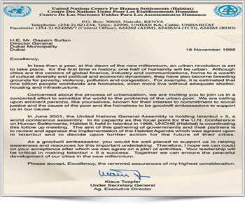 Following the approval of the late Sheikh Maktoum bin Rashid Al Maktoum, then Vice President and Prime Minister of the UAE and Ruler of Dubai, the Director General of Dubai Municipality was chosen as the Good Will Ambassador of the UNCHS in recognition of the distinguished role he has been playing over the past 15 years in establishing a pioneer model of urban development in Dubai. This model got international acclaim and many international organizations have recognized it. The Director General had been awarded a medal of the United Nations Center for Human Settlements. He was instrumental in organizing the second Habitat Conference in 1995. The conference paved the way for the Dubai Declaration, according to which the Dubai International Award for Best Practices to Improve the Living Environment was instituted. The award since has got international acclaim thanks to its noble objectives and outstanding value.