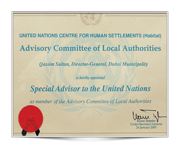 The Director General of Dubai Municipality was chosen as a member of the United Nations Advisory Committee on Local Authorities UNACLA, which is a subsidiary of the United Nations Human Settlements Programme and consists of 20 officials from around the world.